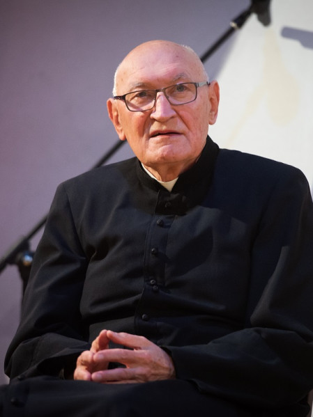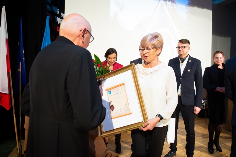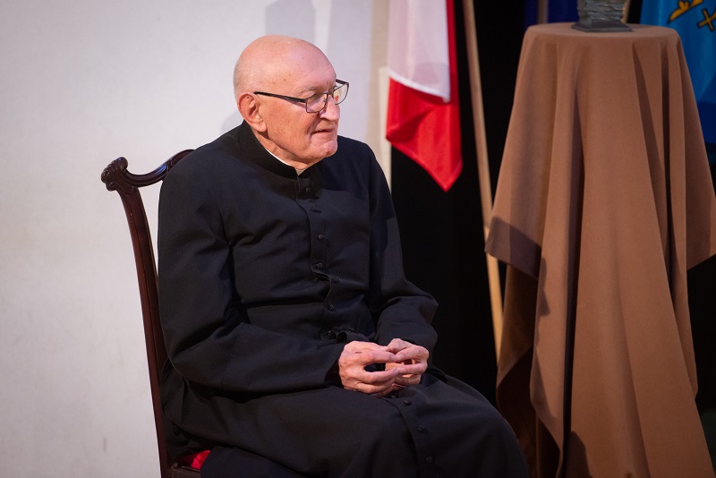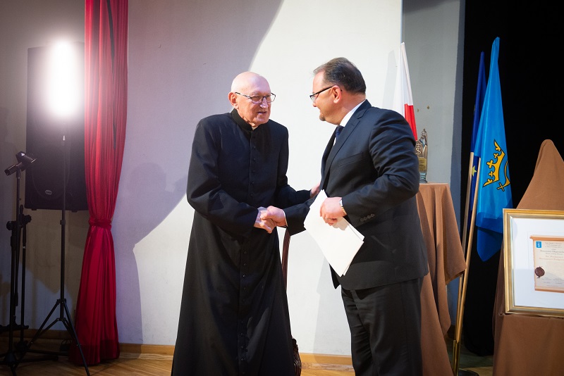 Następnie przyszedł czas na odczytanie Uchwały 11/147/19 - Rady Miejskiej, dotyczącej nadania honorowego obywatelstwa ks. Marianowi Podgórnemu. Laudację na temat nowego honorowego obywatela miasta wygłosił prof. Czesław Sokołowski, w której przypomniał historię powstania parafii Miłosierdzia Bożego oraz zaangażowanie księdza proboszcza w budowę kościoła materialnego i niematerialnego.