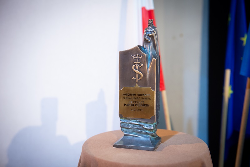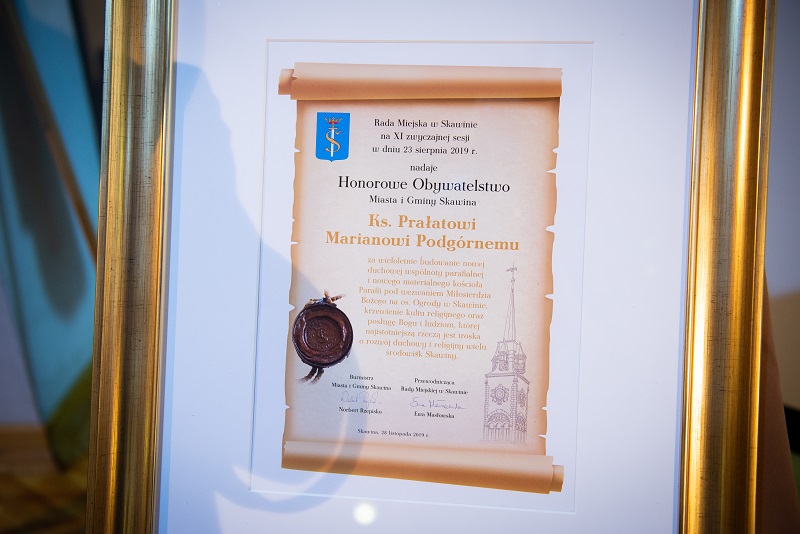 Kolejnym punktem programu było wręczenie Aktu nadania Honorowego Obywatelstwa oraz wręczenie okolicznościowej statuetki. W swoich przemówieniach: Wojewoda Małopolski p. Piotr Ćwik oraz Wicestarosta p. Arkadiusz Wrzoszczyk , dziękowali Radzie Miejskiej za podjęcie uchwały i przyjęcie w poczet honorowych obywateli miasta kolejnego członka, Wojewoda przekazał również ks. Prałatowi jeden ze stu medali na - 100 lecie Niepodległości. Przemówienia wygłosili również Proboszczowie skawińskich parafii, duchowni – przyjaciele, i każdy z nich wspominał heroizm duchowy księdza Mariana Podgórnego, który wywalczył możliwość budowy, a następnie rozpoczął jego budowę, w jednym z najtrudniejszych dla kościoła katolickiego momentów historycznych.