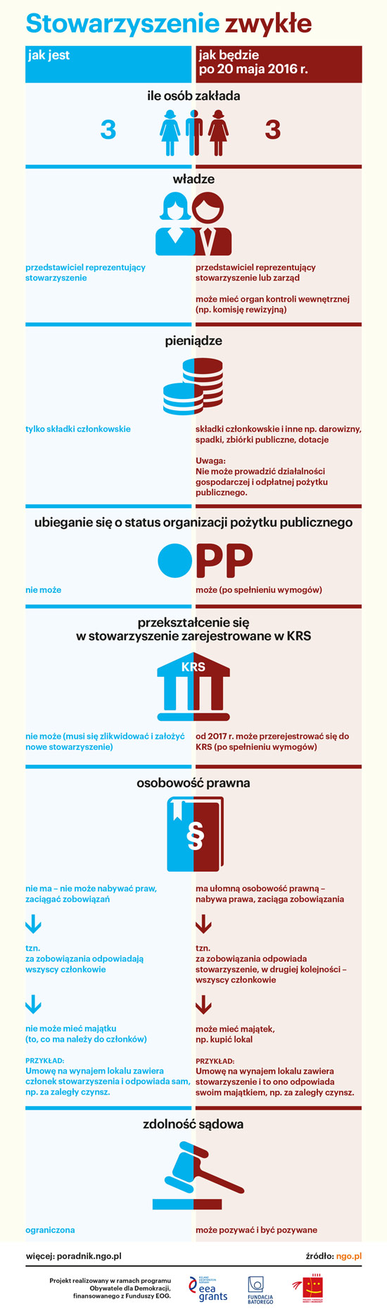 20 maja 2016 r. weszła w życie ustawa o zmianie ustawy - Prawo o stowarzyszeniach. Jest to pierwsza tak poważna nowelizacja Prawa o stowarzyszeniach od czasów jego powstania w 1989 r. W znaczący sposób przekształca obowiązujący wcześniej model stowarzyszeń zwykłych nadając im ułomną osobowość prawną i udostępniając zakazane do tej pory źródła finansowania działań. Daje też nadzieję na łatwiejsze powoływanie do życia stowarzyszeń rejestrowych, dzięki zmniejszeniu wymagalnej liczny osób potrzebnych do ich zakładania oraz likwidacji nadzoru starosty na etapie rejestracji. Szczegóły poniżej.