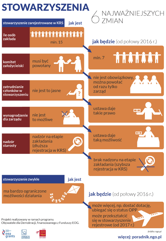 Najważniejsza zmiana to zmniejszenie liczby osób (tzw. członków założycieli), koniecznych do założenia stowarzyszenia do 7. Dzięki temu nasze przepisy upodobnią się w tym zakresie do przepisów innych krajów europejskich, w których wymagana liczba założycieli jest dużo niższa niż 15.